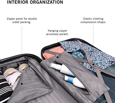 - Interior main compartment is fully lined with a tear-resistant lining and features double-sided packing, a zippered organization pocket, and garment restraint straps to hold your clothes in place.
